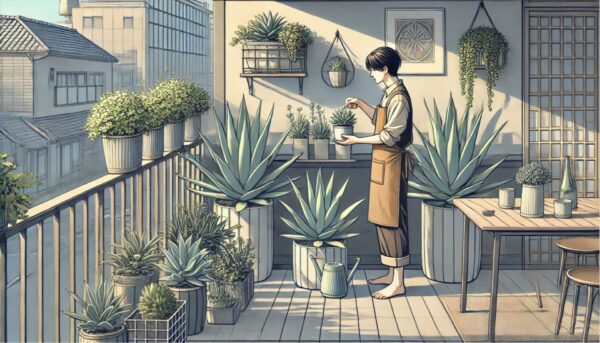 まず、置き場所の選び方が重要です。アガベは日当たりと風通しを好む植物なので、ベランダや窓際など、しっかり光が当たる場所を確保しましょう。ただし真夏の直射日光が強すぎる場所では葉焼けの原因になるため、夏場は遮光ネットなどで調整するのがおすすめです。